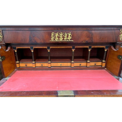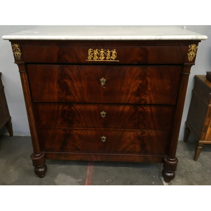 Cassettone lastronato in mogano a tre cassetti e mezzo centrale celante calatoia e scarabattolo architettonico, montanti a colonna e fregi in bronzo. Piano in marmo Secolo XIX (cm 125x123x64) (difetti)