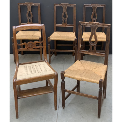 Gruppo di quattro sedie in legno intagliato con schienali a giorno e sedute in paglia, unite a una sedia di differente fattura (difetti)