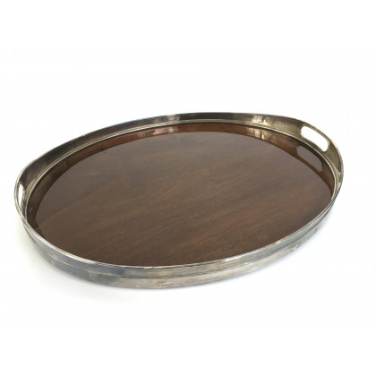 Lotto composto da due posate per dolce e cinque posate a servire, tutte con manici in lamina d'argento e in custodie, unite a un vassoio in legno e metallo argentato marcato Carlo Mozzoni, Milano (lievi difetti)