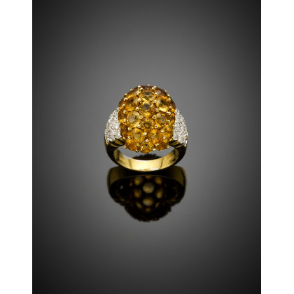 Anello a cupola in oro giallo con quarzi citrini e diamanti per complessivi ct. 1,20 circa, dettagli in oro bianco, g 13,51 circa misura 15/55. Marcato 869 AL.