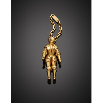 Portachiavi in oro giallo a guisa di armatura pendente, g 21,17 circa, lungh. cm 7 circa. Marcato 356 FI.