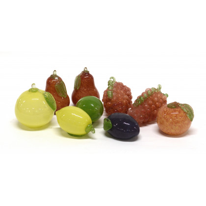 Manifattura di Murano Gruppo di nove sculture in vetro policromo raffiguranti frutti differenti. Italia, secolo XX. (misure diverse) (difetti)