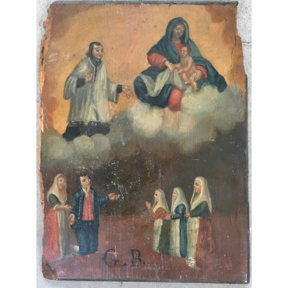 Antico ex voto ad olio su tavola (cm 43x32). Siglato "G.R" in basso (difetti, restauri e mancanze)