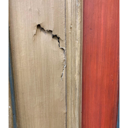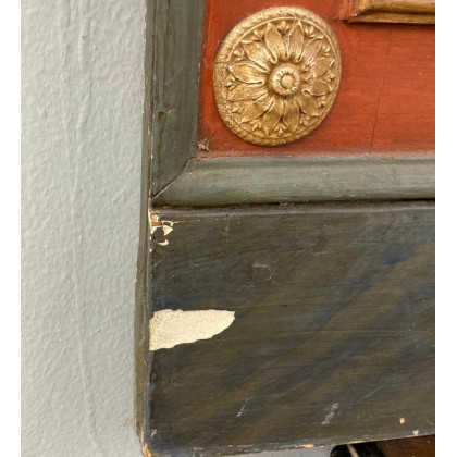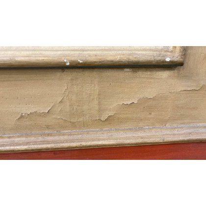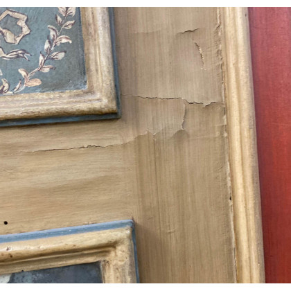 Coppia di caminiere in legno laccato decorato a riquadri contenenti specchi, motivi ornamentali e al centro dipinto in grisaglia raffigurante paesaggio con rovine e figure. Cimasa decorata a festoni, secolo XVIII (cm 238x153) (difetti e restauri)