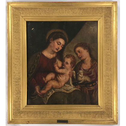 Scuola veneta del secolo XVII "Madonna che allatta il Bambino con Santa Agnese" olio su tavola (cm 49x41). In cornice in legno intagliato (difetti ed estesi restauri)