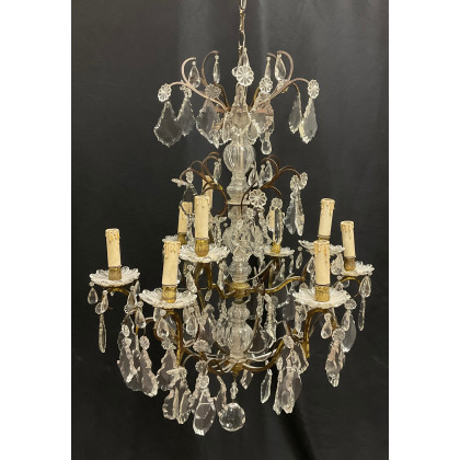 Lampadario a nove luci con struttura in ferro e cristallo, bobeche e pendagli in cristallo sfaccettato (d cm 61) (difetti)