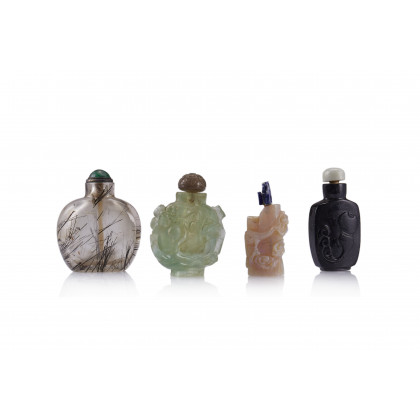 Lotto di quattro snuff bottles in materiali diversi tra cui quarzo, opale, fluorite e materiale artificiale (difetti) (h. max senza tappo 6,5 cm.)