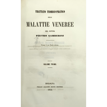[MEDICINA - MALATTIE VENEREE] - GAMBERINI, Pietro. Trattato teorico pratico delle malattie veneree. Bologna: Monti, 1854. 8vo, 2 volumi, 12 tavole a colori, una tavola ripiegata nel primo volume; una tavola fuori testo al secondo. Legatura coeva con dorso in pelle e decori in oro. Seconda edizione di questo trattato dedicato alla cura delle malattie veneree arricchito da illustrazioni scientifiche precise e "d'impatto" [SI AGGIUNGE] BELL Benjamin. Trattato della gonorrea virulente e della lue venerea. Venezia: Baseggio, 1795. 8vo, 2 volumi in uno. Prima edizione italiana a soli due anni dall'originale inglese del 1793. Non collazionato e difetti da esaminare.