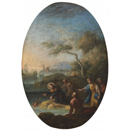 Scuola del secolo XVIII Scena miracolosa Olio su tela ovale, cm 29x41 in cornice (difetti)