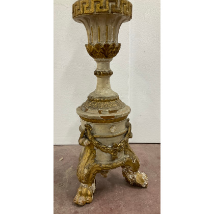 Torciera in legno intagliato, laccato e dorato a foglie e volute terminante a piedi ferini. Secolo XIX (h cm 115) Montata a luce elettrica (difetti e mancanze)