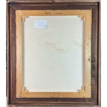 "Bambino con teatrino" 1988 olio su tela cm 70x60 firmato e datato in basso a destra. In cornice (lievi difetti) Provenienza Galleria Nuovo Sagittario, Milano (etichetta al retro); collezione privata, Milano