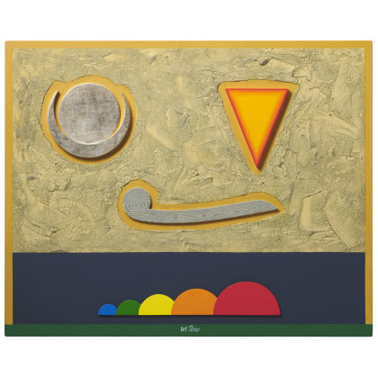 "Senza titolo" collages, sabbia, acrilico, oro bianco in foglia su tavola cm 60x75 Firmato in basso in centro Provenienza Collezione privata, Monza Brianza Opera accompagnata da certificato di autenticità su fotografia firmato dall'artista