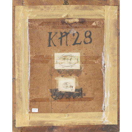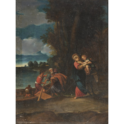 Scuola bolognese della prima metà del secolo XVII "Fuga in Egitto" olio su rame (cm 38x29 ca.) tavola a chiusura del telaio con antiche etichette indicanti provenienza (Galleria Manfrin) e numero di inventario al retro del rame iscrizione "E.n.56" in cornice (difetti e restauri)