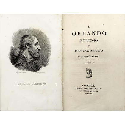 ARIOSTO, Ludovico. L'Orlando furioso. Firenze : presso Giuseppe Molini all'insegna di Dante, 1821. 4 volumi, 8vo (225 x 147mm). Occhielli, antiporta con ritratto dell'autore al primo volume (alcune carte distaccate, lievi fioriture). Mezza pelle verde coeva, titoli e decori in oro ai dorsi (difetti, dorso del primo volume parzialmente distaccato). [INSIEME A, dello stesso autore:] - Rime e satire. Firenze : presso Giuseppe Molini all'insegna di Dante, 1822. Il lotto non è collazionato, presenta difetti da esaminare e non è passibile di storno. [5]
