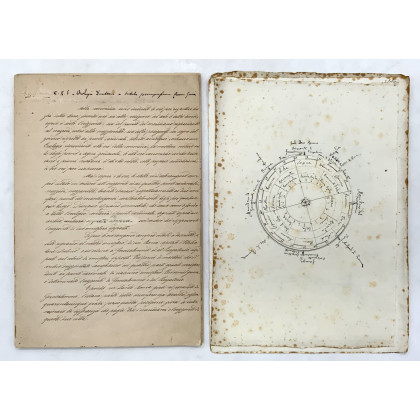 [MANOSCRITTO] - Orologio Dantesco e Tavola Cosmografica. (310 x 210mm). Manoscritto risalente al XIX secolo su carta, vergato da più mani e composto da 77 pagine, più tre tavole fuori testo. Il manoscritto riprende l'opera di Marco Giovanni Ponta, pubblicata nel 1892, e riproduce a mano anche le tre illustrazioni (fioriture alle tavole, alcune lievi bruniture)