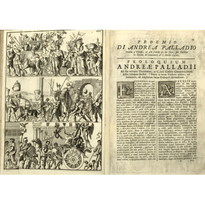 CESARE, Gaio Giulio. Quae extant omnia. [Venezia: Albrizzi, 1737]. Un'opera in due volumi, 4to (272 x 195mm). Antiporta calcografica, vignetta calcografica al frontespizio stampato in rosso e nero, testatine e iniziali calcografiche, 6 tavole calcografiche (una pagina di indice mancante e sostituita da una manoscritta nel secondo volume, occasionali tracce di polvere e lievi bruniture). Pergamena coeva, titolo in oro ai dorsi, tagli decorati a spruzzo (lievi difetti) [2]