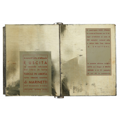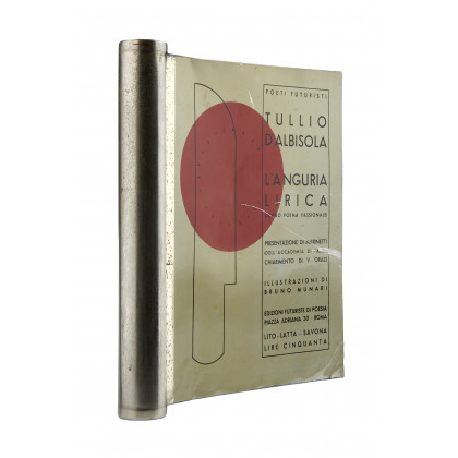 TULLIO D'ALBISOLA (1899-1971) - Bruno MUNARI (1907-1998) - L'Anguria lirica (lungo poema passionale). Presentazione di Marinetti (dell'Accademia d'Italia). Chiarimento di V. Orazi. Illustrazioni di Bruno Munari. Roma e Savona: Edizioni Futuriste di Poesia, senza data [ma 1933?]. Copia in buone condizioni e notevolmente priva di ossidazioni di uno straordinario volume, autentico libro-manifesto e tra le opere fondative del movimento futurista. Celebre tanto per le visionarie illustrazioni di Bruno Munari quanto per l’audace legatura e la stampa su latta, che ne fanno un oggetto editoriale radicale e di eccezionale rilievo. Gli esemplari disponibili sul mercato sono pochissimi: l'edizione di 101 copie effettivamente stampate ne vide solo 50 messe in commercio. Si tratta del secondo e ultimo libro lito-latta pubblicato dopo "Parole in libertà futuriste olfattive tattili termiche" di Filippo Tommaso Marinetti e Tullio d'Albisola del 1932. Il termine lito-latta fu coniato dall'industriale Vincenzo Nosenzo di Savona, produttore di scatole metalliche per alimenti stampate in litografia; a lui la dedica nel libro "all'amico capitano. geniale audace dinamico industriale creatore della lito-latta editore futurista unico al mondo". Si legge nella presentazione "Nello Stabilimento LITO-LATTA di Savona, dove l'ampia latta del mare viene stampata con la tonda pietra d'oro del sole e la quadra turchina del cielo, tra folle di bellissime operaie i cui occhi neri brillanti gareggiano con le vernici veloci delle automobili, fra tuffi di muscoltature atletiche rosse-brune giù a spaccare liquidi cobalti, tinnì nascendo il primo libro latta interamente metallico.". Il libro è la terza opera editoriale di Munari e fu esposta e premiata a Parigi alla mostra di grafiche decorative. Andel, Design d'impaginazione d'avanguardia 1900-1950, p. 115; Cammarota, Futurismo, 135.2. 8vo (196 x 155mm). Stampato su 21 fogli di latta, copertina inclusa, con 12 litografie a piena pagina di Bruno Munari (ultimi fogli e pochi altri con alcune ammaccature e difetti). Legatura editoriale con dorso in cilindro in latta (minimi segni del tempo, ammaccature e graffi).