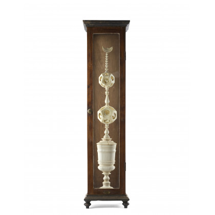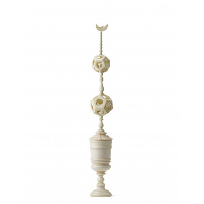 Coppa in avorio intagliato e tornito con coperchio decorato da due poliedri con altri poliedri all'interno e puntale con una mezza luna Germania, fine secolo XVII (cm 8x65) Entro teca (difetti, luna staccata, restauri) Il presente lotto è accompagnato da documentazione CITES IT/CE/2024/AR/00351